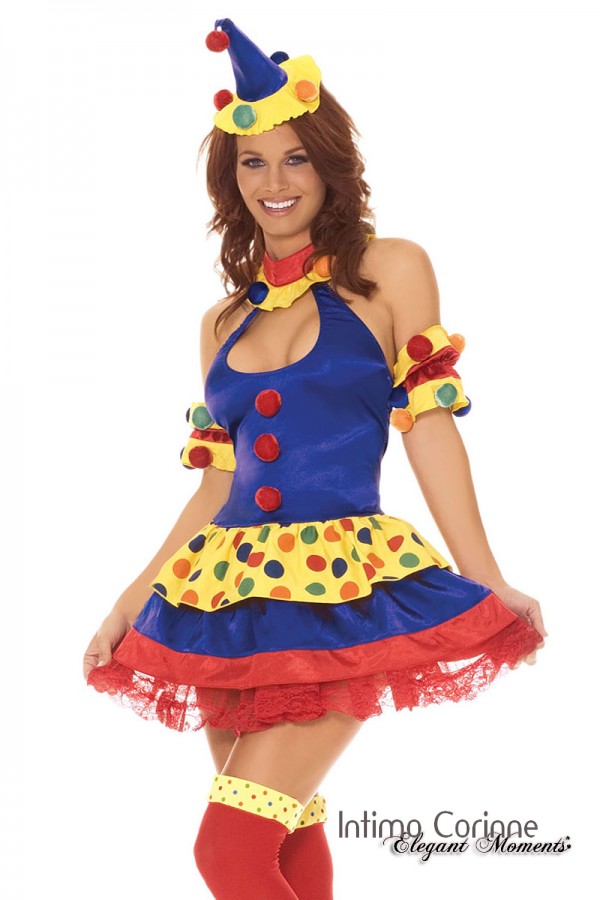 Travestimento da clown 4 pezzi arricchito da pon pon colorati. Comprende miniabito blu e rosso con balza gialla a pois e collarino annesso, braccioli, cappellino e calze in coordinato. Sottogonna esclusa acquistabile separatamente.