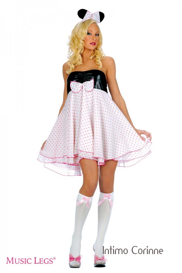 Costume topolina 2 pezzi a pois rosa con fascia superiore in tessuto nero elasticizzato ed arricciato frontalmente. Parte inferiore svasata a doppio strato, chiusura laterale mediante zip nascosta e grande fiocco anteriore cucito sotto il seno. Comprende cerchietto con orecchie in velluto e fiocco in coordinato.