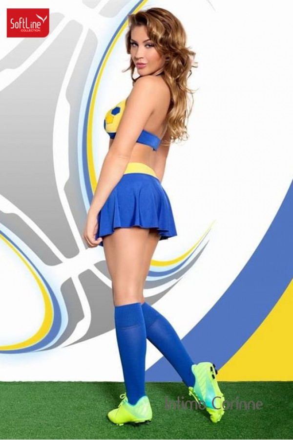Simpatico completo calciatrice 3 pezzi in tessuto giallo e blu con pallone ricamato sulle coppe. Comprende reggiseno da legare al collo e sulla schiena, gonnellino e calze.