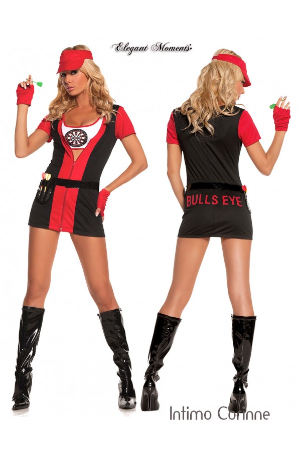 Travestimento da giocatrice di freccette 6 pezzi. Comprende miniabito nero-rosso con cerniera anteriore, top bianco con disegno bersaglio, cintura in vinile con foderino porta-frecce, guanti corti senza dita, visiera e blister con tre freccette magnetiche!