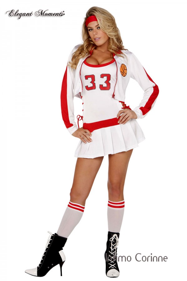 Travestimento da giocatrice di pallacanestro. Comprende miniabito bianco con dettagli rossi caratterizzato da aperture laterali stringate, numero 33 frontale e parte inferiore plissettata; giacchetta corta a maniche lunghe con palla da basket cucita sul petto, cerniera anteriore e stampe sulla schiena. Include fascia rossa per la testa, calze corte e borsa a forma di palla.