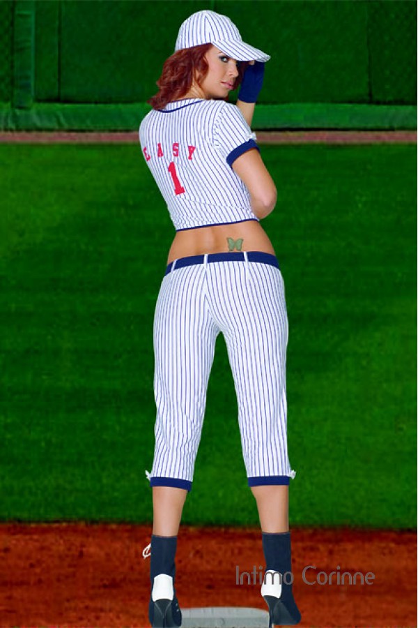 Costume baseball 5 pezzi di colore bianco con sottili righe blu. Comprende pinocchietti, cintura, maglietta a maniche corte, guanti corti a mezze dita e berretto.