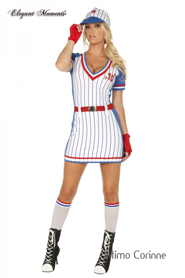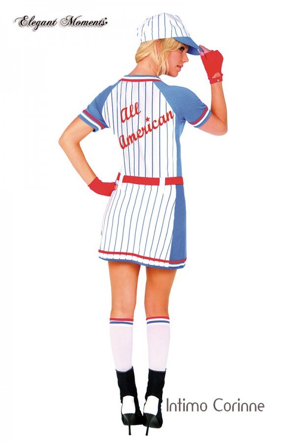 Travestimento giocatrice di baseball 5 pezzi. Comprende miniabito a righe blu-bianco con scritte e rifiniture rosse, berretto, calze, cintura rossa e guanti corti a dita libere.