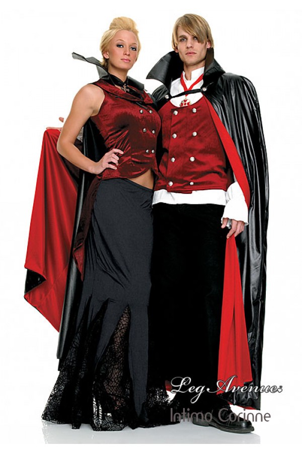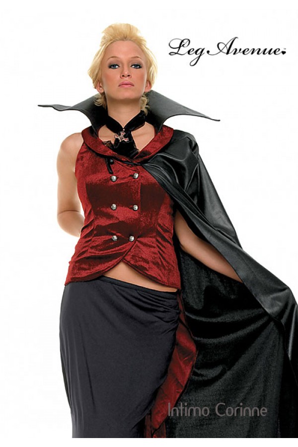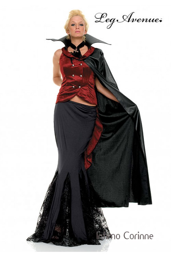 Splendido travestimento vampira. Include mantello, gilet in velluto con ampio colletto, collana con medaglione e gonna taglio diagonale con inserto in pizzo effetto tela di ragno.