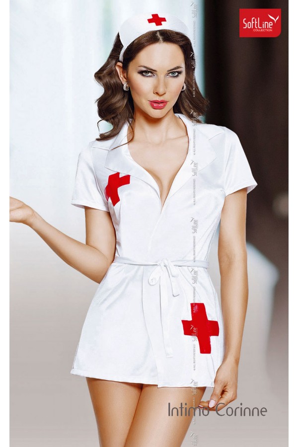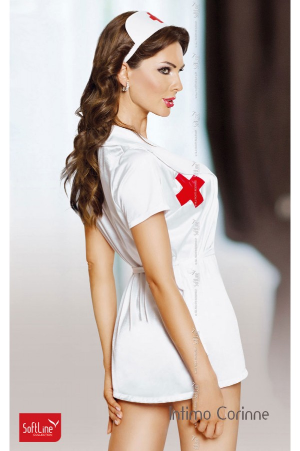Costume infermiera in tessuto satin elasticizzato. Comprende grembiule da legare in vita decorato con grandi croci rosse, cintura e cuffietta.