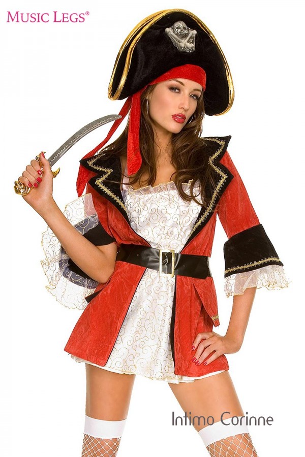 Costume corsara 2 pezzi abbellito da sontuosi ricami dorati. Composto da una graziosa giacca in velluto con annesso davantino bianco in tessuto elasticizzato, effetto mini abito, da fissare internamente tramite zip e bottoni a pressione. Comprende cintura in similpelle. Cappello ed accessori esclusi.