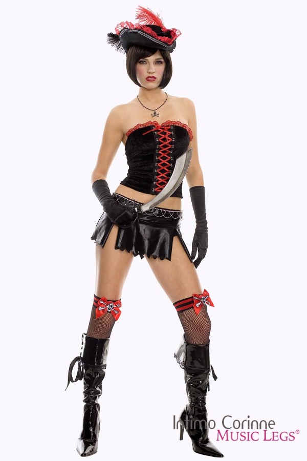 Costume pirata gotica 5 pezzi. Comprende top nero in ciniglia con stringatura anteriore e merletto rosso sopra abbinato ad una minigonna in tessuto lucido abbellita con una catenella di strass e perline, spacchetti laterali e bordo inferiore a zig zag. Include inoltre bellissimo cappello rigido con piume, spada, guanti e spalline trasparenti removibili.