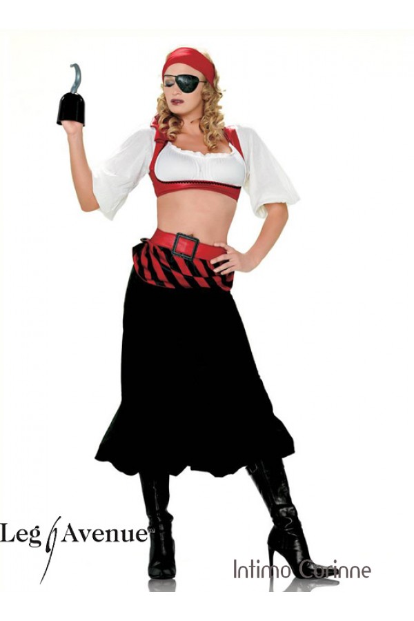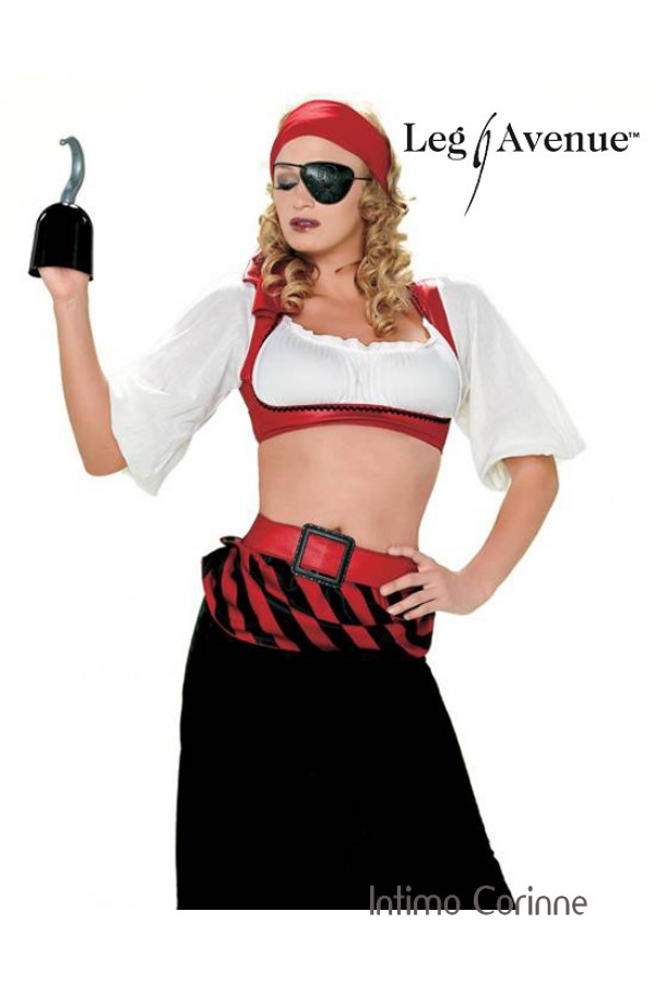 Costume pirata Capitan Uncino 5 pezzi. Comprende top alla contadina, gonna lunga nera con risvolto a strisce rosse e finta cintura cucita ai lati, bandana, copri-occhio con elastico ed uncino.