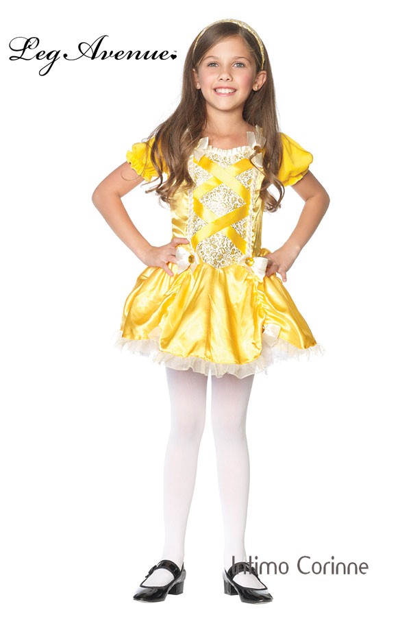Vestito 2 pezzi da reginetta del ballo. Comprende vestitino giallo con mezze maniche a sbuffo ed inserto broccato posto sul davanti con decorazioni dorate e nastri gialli in satin incrociati. Rifiniture bianche tramite bordini bianchi arricciati ed applicazioni di fiocchi con pietra ambrata. Parte inferiore scampanata con increspature elasticizzate. Cerchietto coordinato incluso.