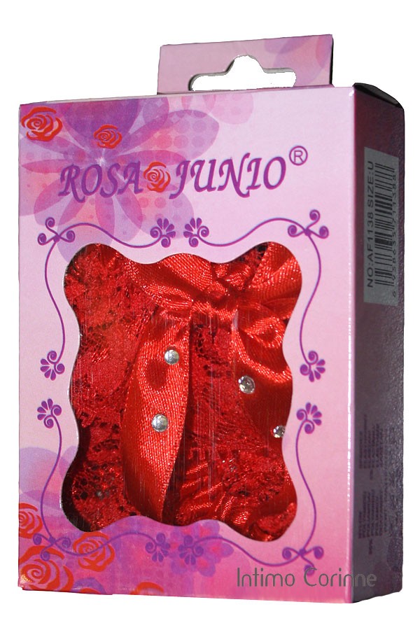 Scatoletta contenente due belle giarrettiere rosse in pizzo floreale con nastro centrale elasticizzato e fiocchetto in raso arricchito da quattro strass.