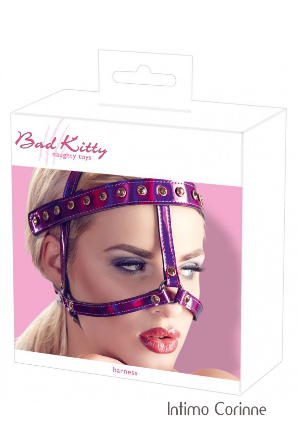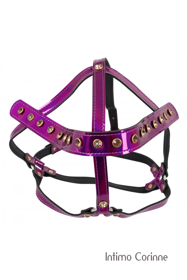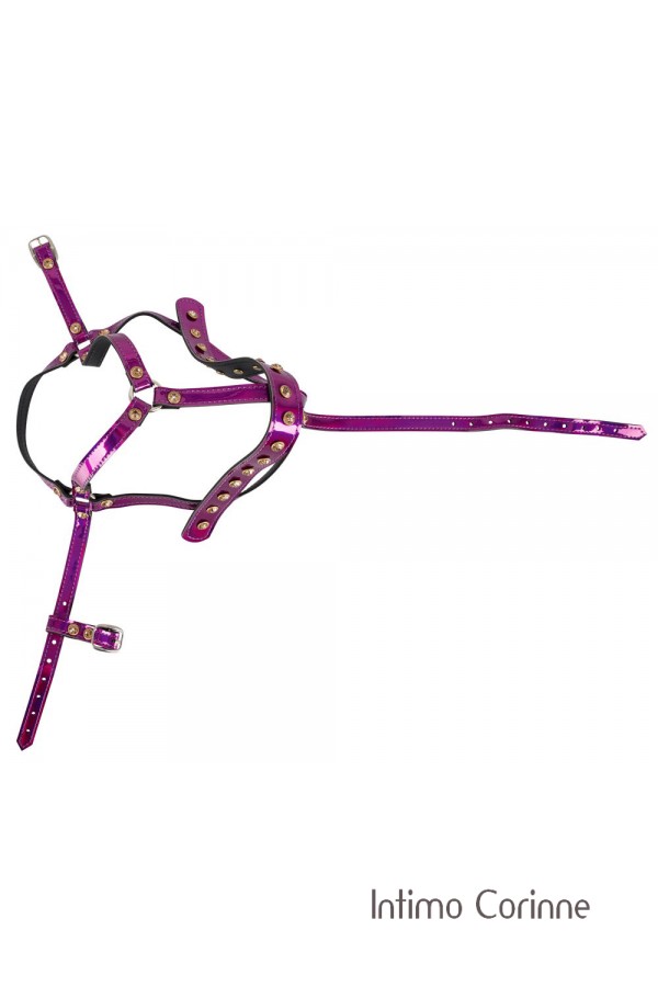 Imbracatura facciale regolabile impreziosita da borchie dorate con strass, anelli di giunzione e fibbie metalliche. Color fucsia metallizzato che conferisce riflessi brillanti con diverse sfumature di tonalità.
