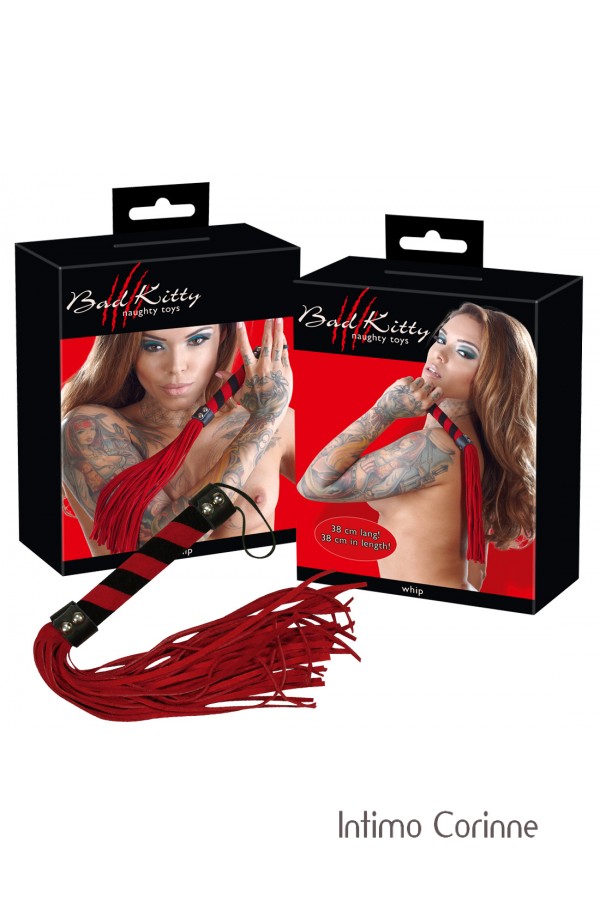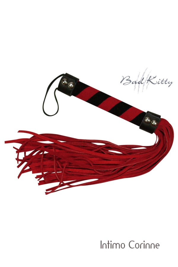 Frustino con morbide strisce in pelle scamosciata. Manico intrecciato bicolore rosso/nero. Lunghezza: 38 cm. circa.