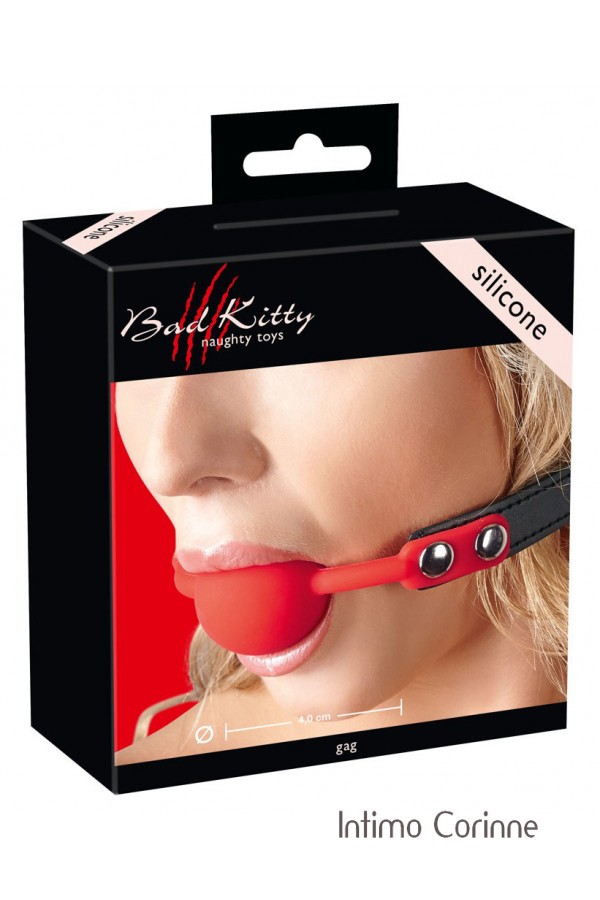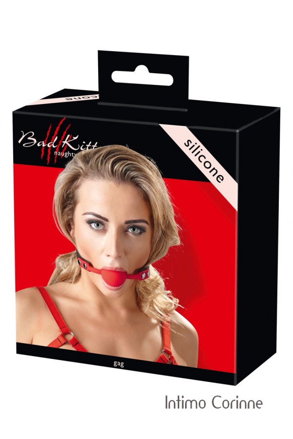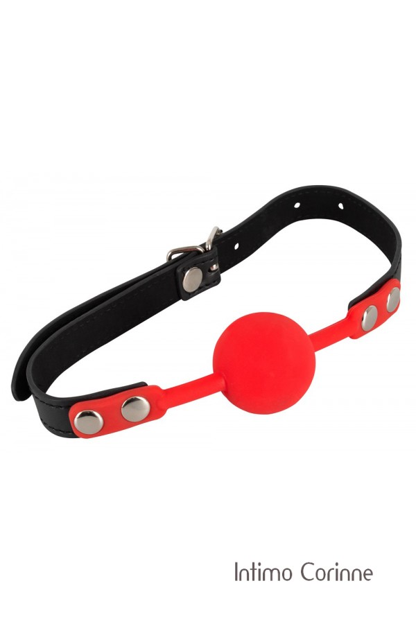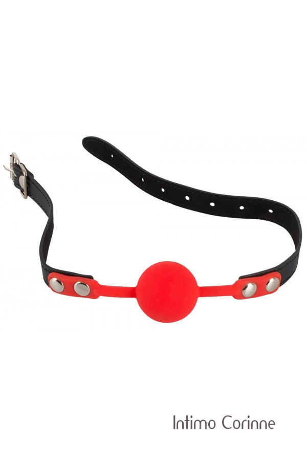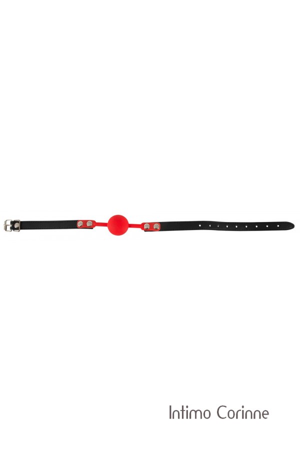 Bavaglio composto da una pallina rossa in morbido silicone collegata ad una cinghia nera in similpelle, regolabile mediante fibbia da chiudere dietro la testa. La circonferenza può essere regolata da 42 a 58 cm. Ø pallina: 4,0 cm. Materiali: silicone, poliuretano e metallo. Privo di ftalati secondo il Regolamento UE REACH.