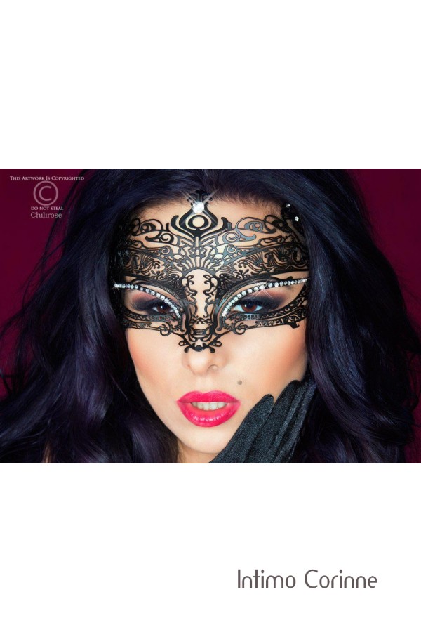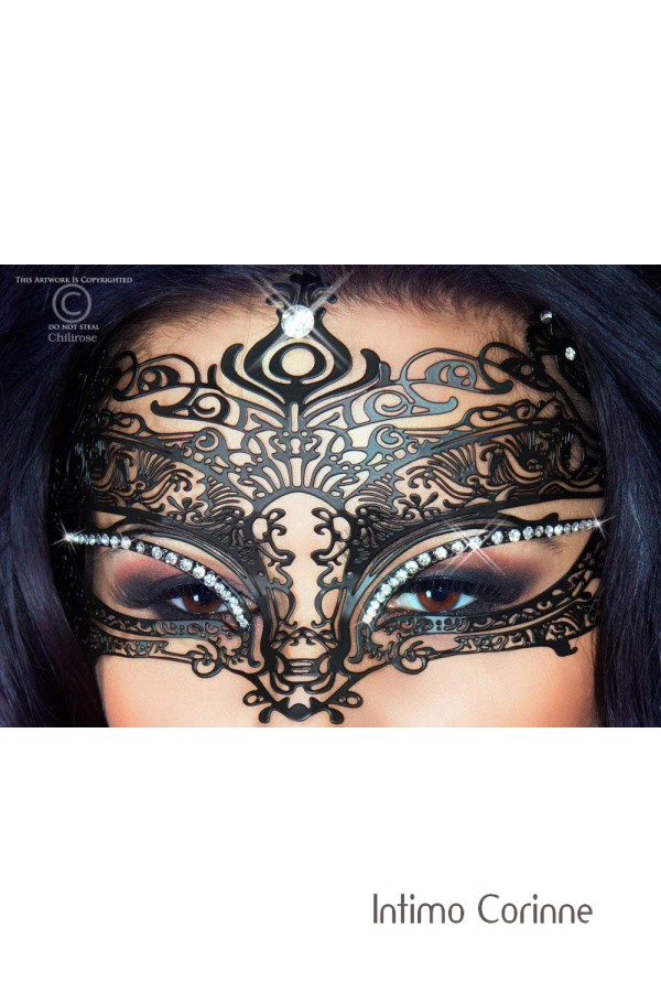 Originale maschera nera metallica filigranata, anatomica e flessibile, impreziosita da numerose applicazioni di strass. Legatura mediante fettucce nere in raso.