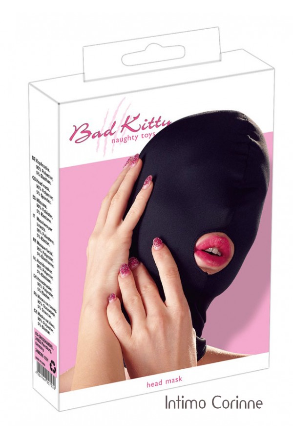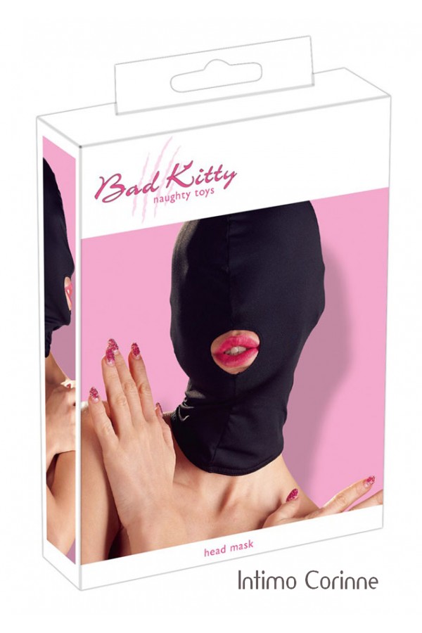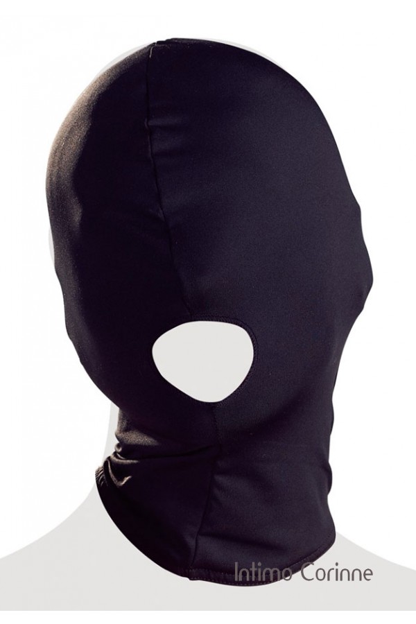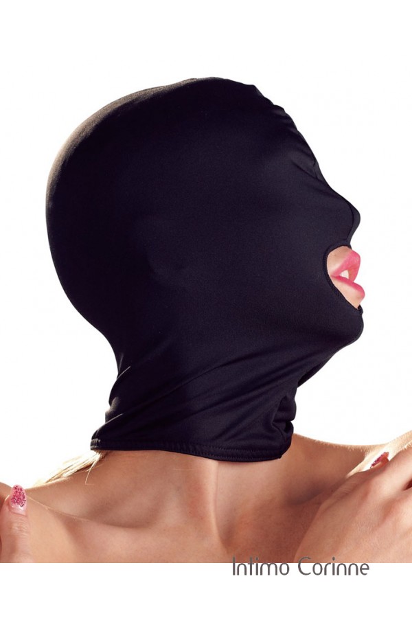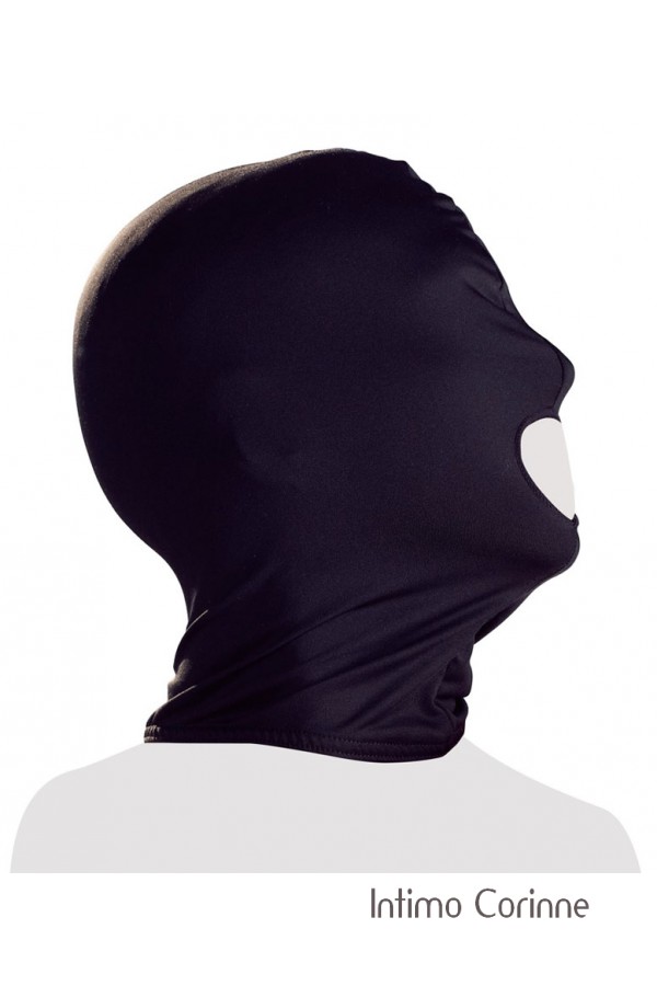 Maschera integrale realizzata in morbido tessuto nero elasticizzato con apertura per la bocca.