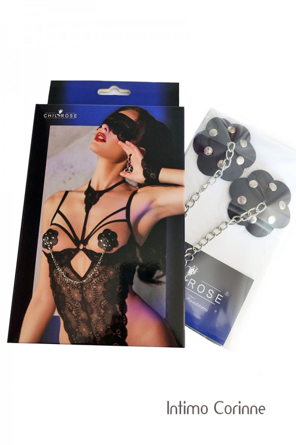 Copricapezzoli neri in similpelle a forma di fiore con borchie e catena di giunzione argentata. Muniti all'interno di biadesivo in silicone con pellicola protettiva.