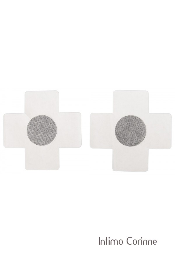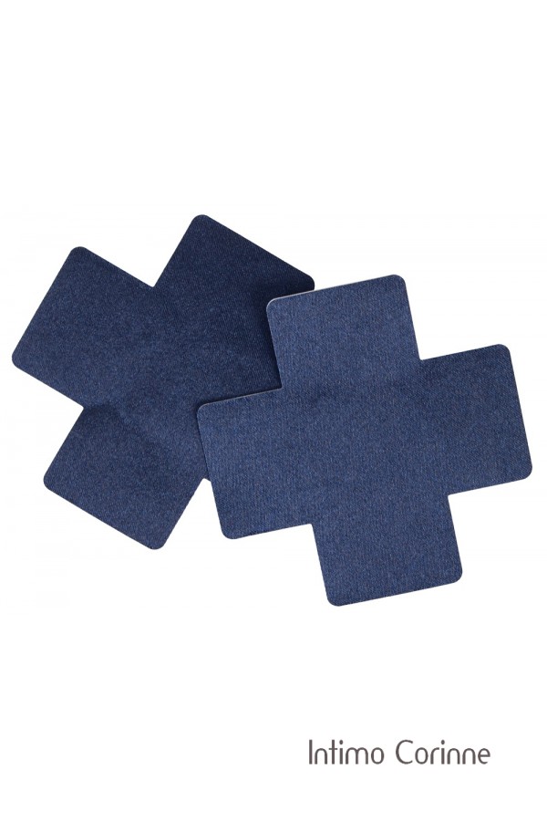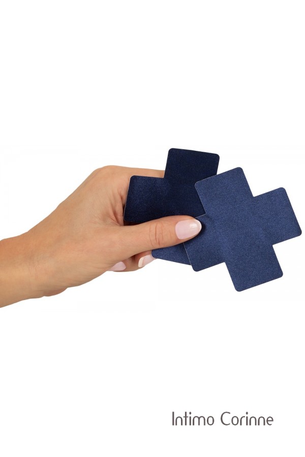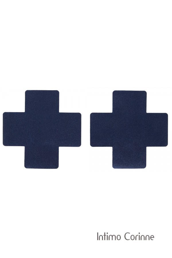 Coppia di copricapezzoli di un bellissimo color blu scuro in tessuto satinato con strisce adesive sul retro. Dimensioni: 8 x 8 cm. Poliestere.