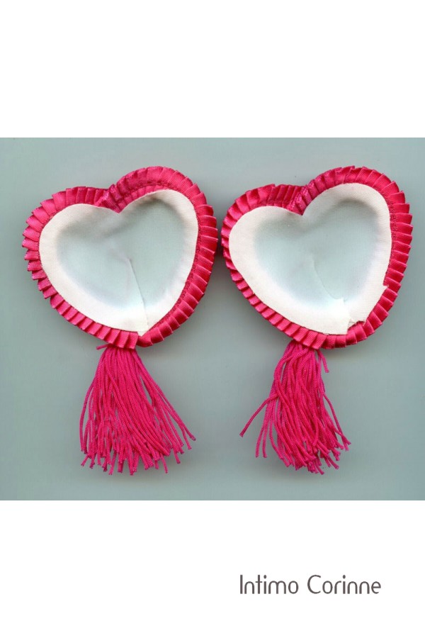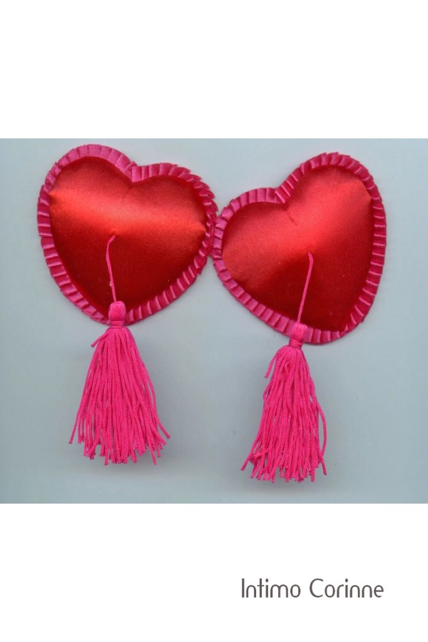 Raffinati copricapezzoli in raso a forma di cuore, bordo plissettato e pendaglio centrale con frange rossi. Possono essere applicati con biadesivo o colla per il corpo (spirit gum), non inclusi nella confezione.