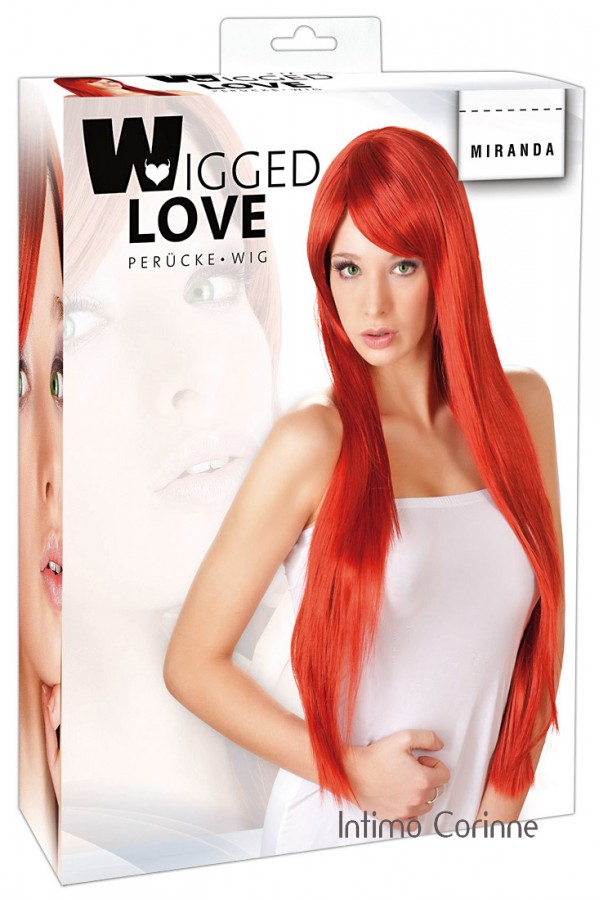 Parrucca con capelli rossi lisci con frangia. Realistica e di alta qualità. Lunga circa 80 cm. Lavabile facilmente con acqua e shampoo.