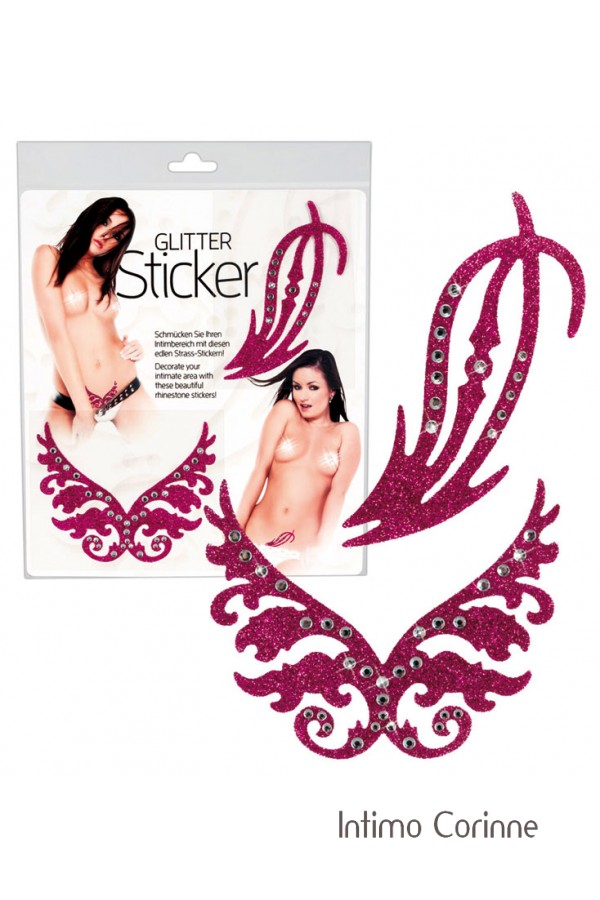 Decorazione adesive per il corpo ricoperte da glitter fucsia ed applicazioni di strass. Si applicano semplicemente a pressione sulla pelle. Per il riutilizzo incollare nuovamente lo sticker alla pellicola.
