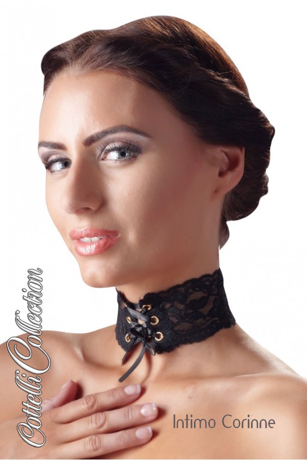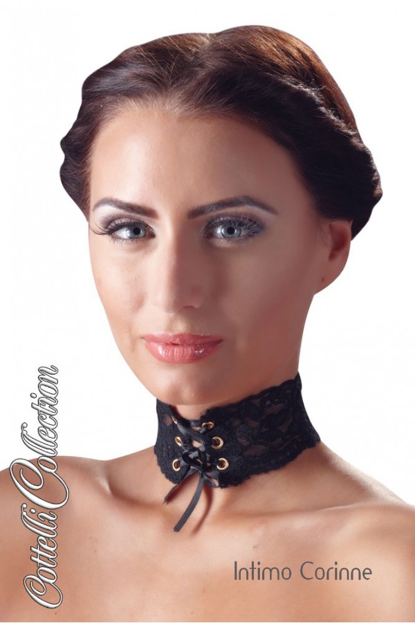 Collarino nero in morbido pizzo elasticizzato con stringatura regolabile. Lunghezza 32 cm, altezza circa 6 cm.