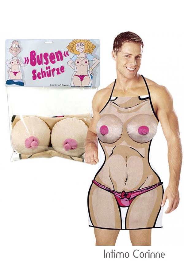 Grembiule bianco con torso femminile stampato e morbide seno in peluche. Legatura nella parte posteriore.