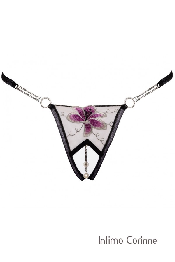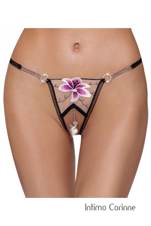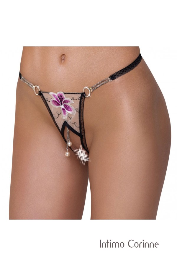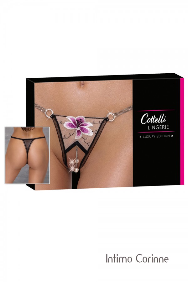 Seducente tanga aperto al cavallo della prestigiosa linea Luxury Edition by Cottelli Lingerie, realizzato in morbido tulle beige con un bellissimo fiore ricamato nella parte anteriore. L'area del cavallo è adornata da 2 piccole catene pendenti con perle sintetiche che decorano e stimolano le parti intime e possono essere rimosse. Fianchetti elastici impreziositi da catene e anelli di strass nella parte anteriore (su entrambi i lati). Inserto triangolare in microrete nera sul retro per una vestibilità perfetta.