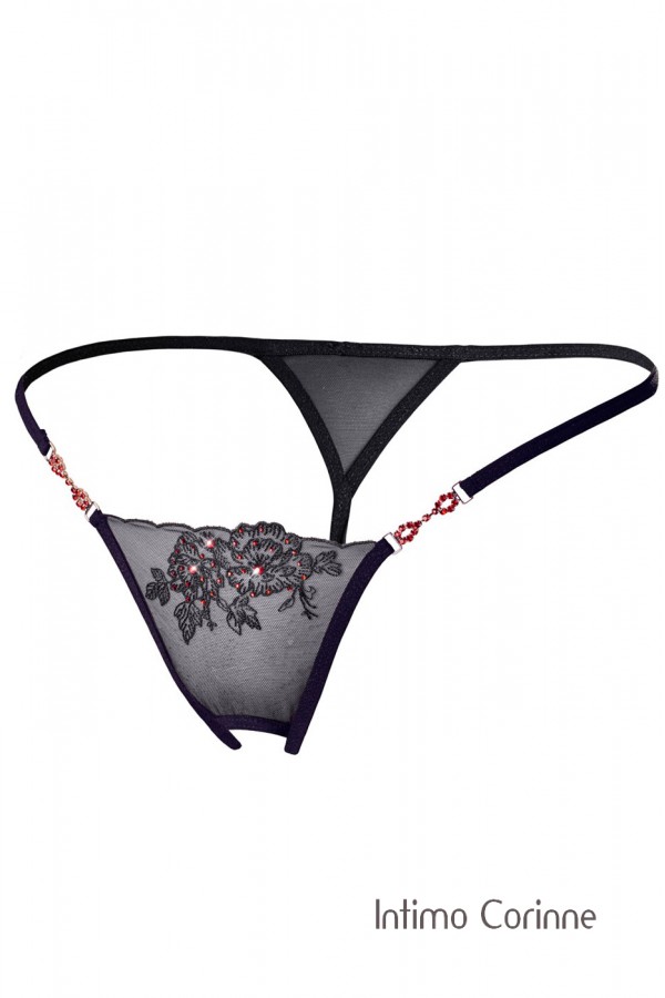 Tanga aperto al cavallo della prestigiosa linea Luxury Edition by Cottelli Lingerie, realizzato in morbido tulle nero arricchito con ricami floreali in rilievo e pietre ornamentali rosse. Fianchetti elastici impreziositi con piccole catene di strass rossi nella parte anteriore (su entrambi i lati).