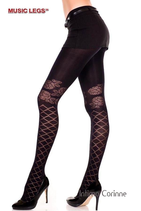 Collant nero coprente con disegno romboidale nella parte inferiore e rosa ricamata sopra il ginocchio.