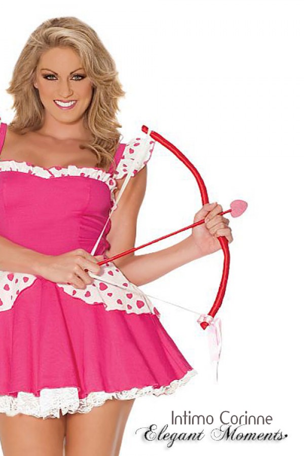 Grazioso arco imbottito rivestito con nastro in raso rosso e freccia con punta rosa brillantinata a forma di cuore.