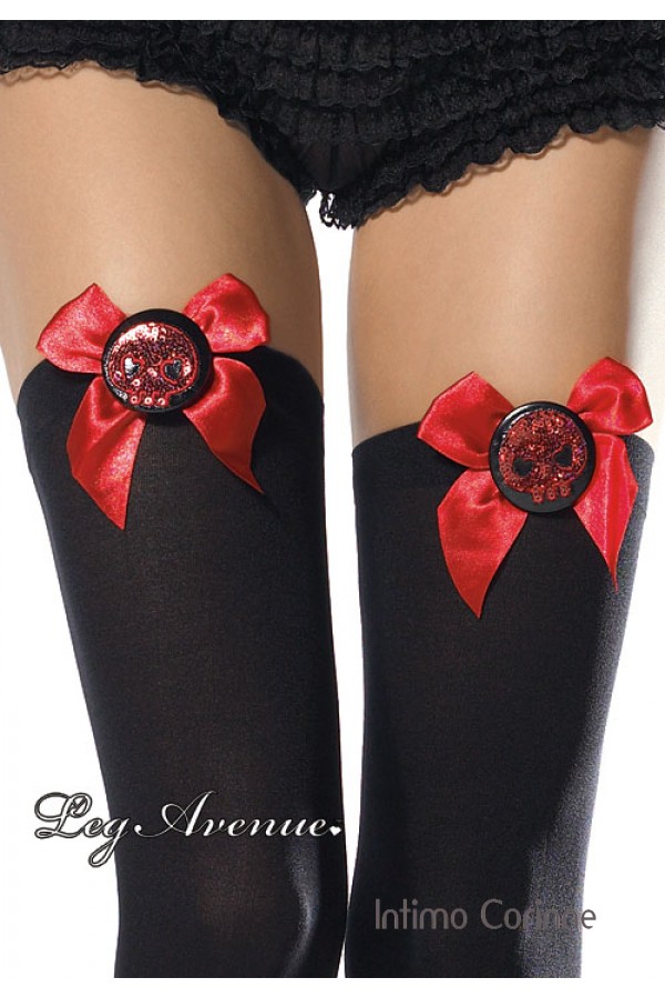 Calze coprenti con grande fiocco anteriore rosso che contiene al centro un inserto raffigurante un simpatico teschio. Ideali da abbinare ai travestimenti in tema, ma non solo...