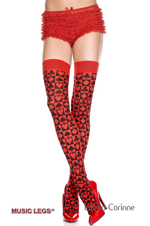 Calze autoreggenti rosse opache munite di balza elastica con disegni raffiguranti i semi delle carte da gioco disposti a scacchiera.