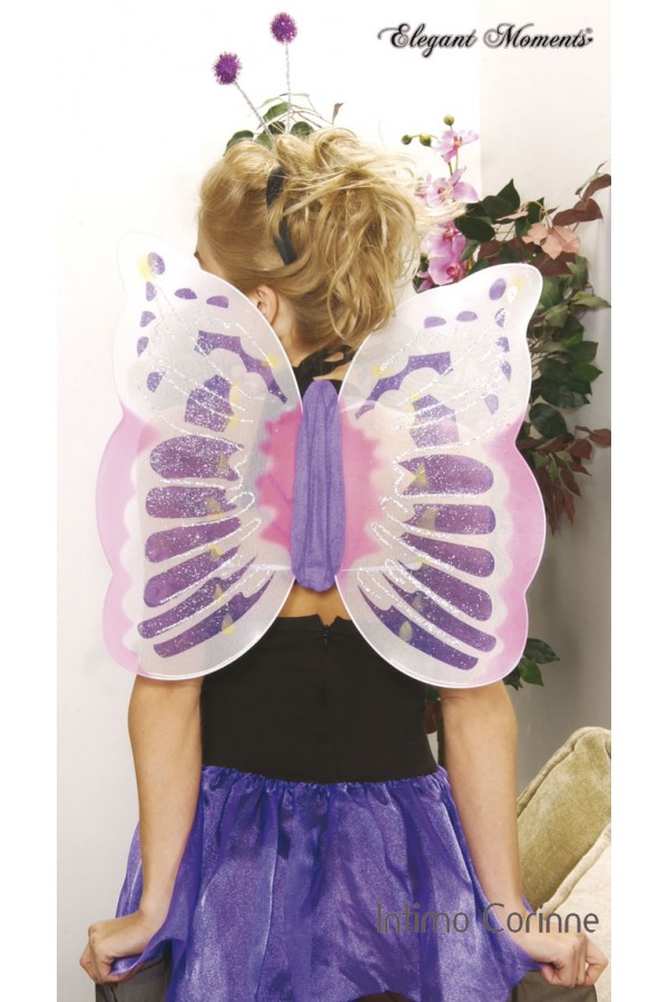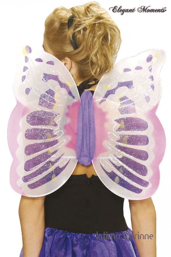 Graziose ali bianche, viola e rosa con glitter argentati. Fissaggio alle spalle tramite fettucce elastiche.