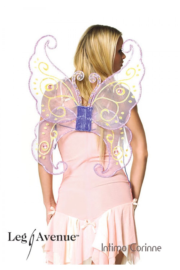 Graziose ali trasparenti con decori brillanti rosa sul bordo e gialli all'interno, impreziosite da pietre ornamentali colorate. Munite di lacci per fissaggio sulle spalle.