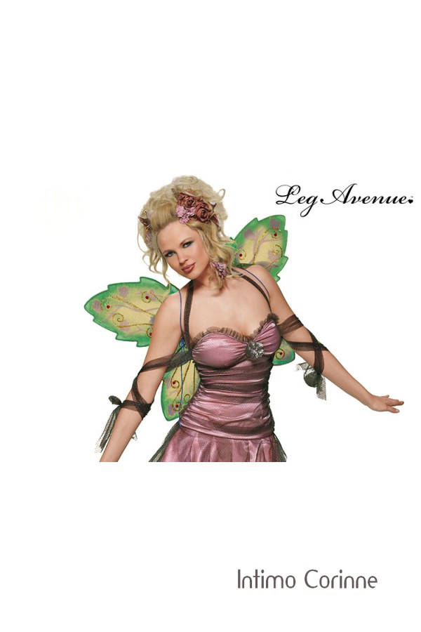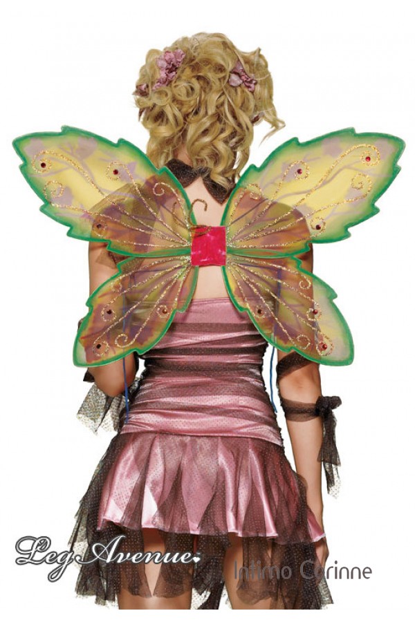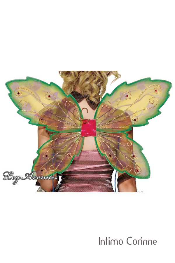 Bellissime ali da fata con colorazioni autunnali, bordi di colore verde e sfumature di giallo e marrone all'interno, rifiniture glitterate color oro per un effetto magico.