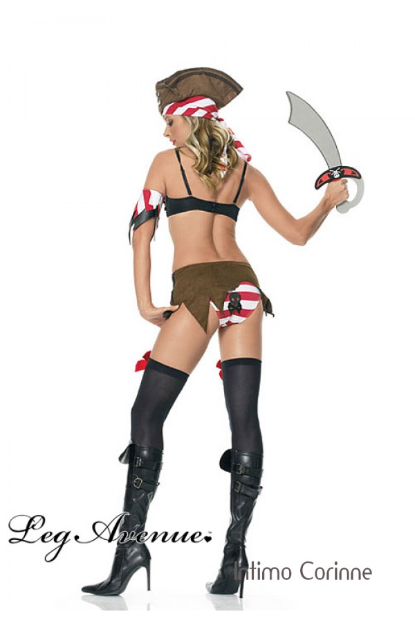 Bellissimo completo 4 pezzi da pirata in tessuto scamosciato che comprende reggiseno leggermente imbottito con ferretto, toppe cucite sulle coppe, allacciatura dietro la schiena, gonnellino sfrangiato con cintura in similpelle cucita ai lati, slip a strisce bianco-rosse con teschio cucito nella parte posteriore e fascia abbinata sul braccio con chiusura a velcro. (Esclusi accessori, cappello e calze).
