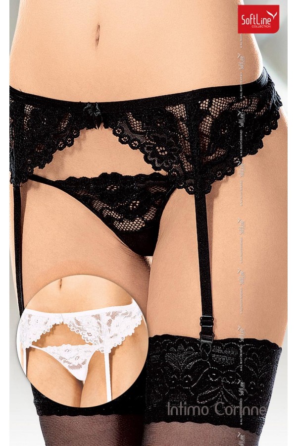 Fascia reggicalze in pizzo floreale bianco munito di quattro ganci elastici, fiocchetto decorativo anteriore e fettuccia posteriore regolabile per una vestibilità perfetta. Include perizoma coordinato.