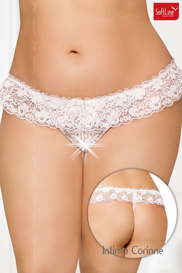 Perizoma aperto al cavallo in morbido pizzo bianco molto elasticizzato in vita. Decoro anteriore centrale con fiocchetto e strass sintetico.