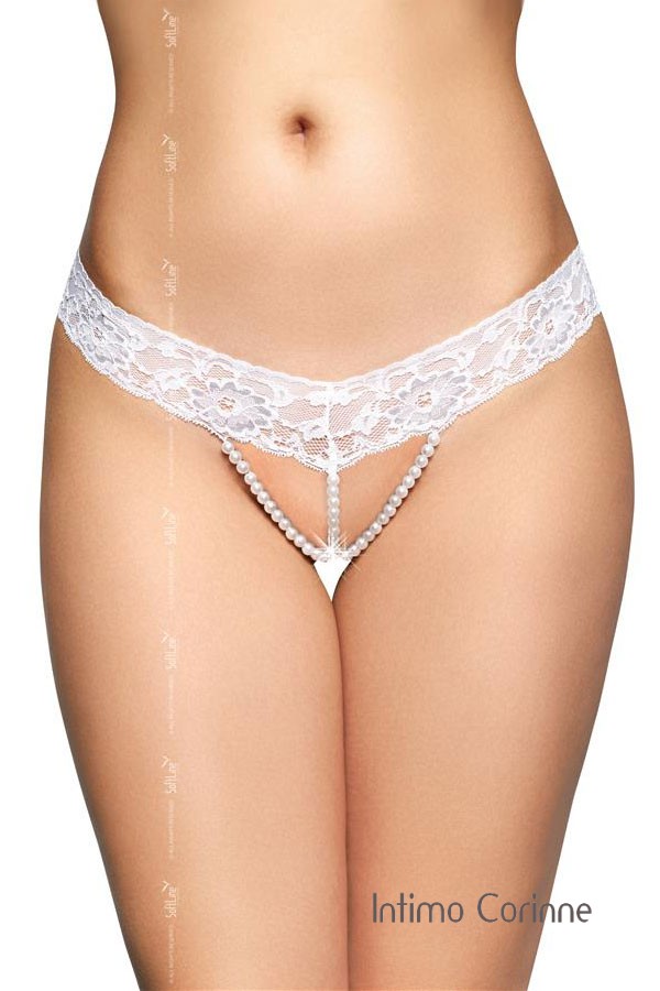 Tanga bianco composto da una fascia in pizzo floreale con tre fila di perle che attraversano il cavallo aperto.
