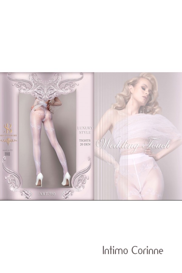 Collant bianco velato in Lycra con riga posteriore tratteggiata, ramage floreali e motivi romboidali nella parte superiore, il tutto arricchito con ricami in lurex argentato. Tassello in cotone. 20 denari. Ideale per cerimonie ed eventi importanti in cui stile ed eleganza si fondono perfettamente!