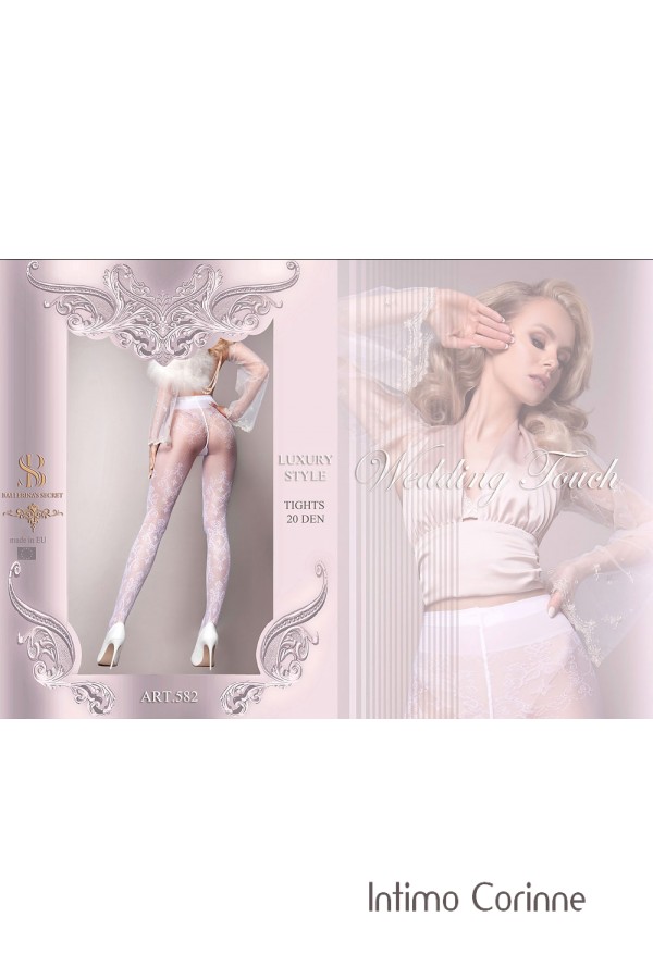 Collant bianco velato in Lycra con sontuosi ricami su tutta la gamba. Tassello in cotone. 20 denari. Punte rinforzate. Ideale per cerimonie ed eventi importanti in cui stile ed eleganza si fondono perfettamente!