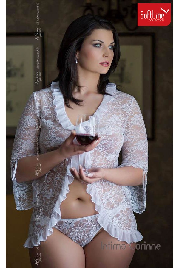 Seducente vestaglietta corta in morbido pizzo floreale bianco con bordi ondulati in tulle, legatura anteriore sul seno e maniche a 3/4. Include perizoma coordinato.