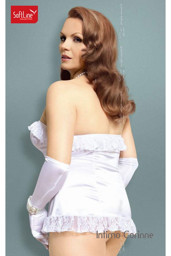 Corpetto bianco in morbido raso sintetico elasticizzato con volants in pizzo lungo i bordi e chiusura anteriore tramite gancetti metallici. Include perizoma.