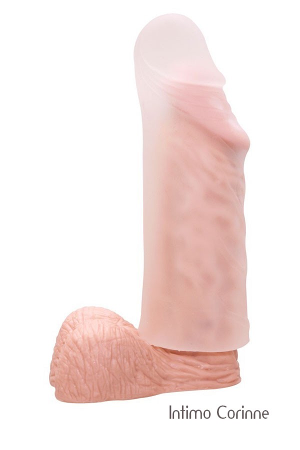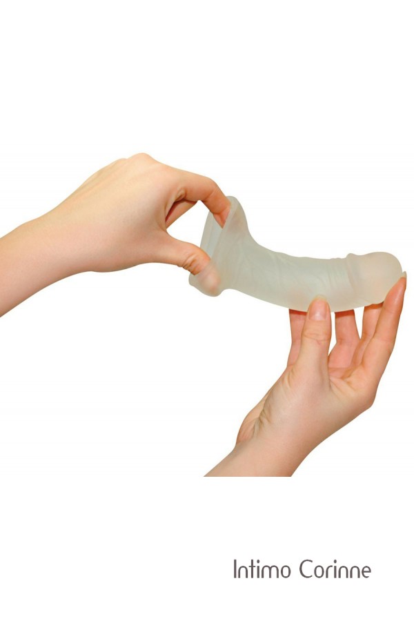 Estensore maschile trasparente con venatura leggermente in rilievo e stimolante. Basta applicare la guaina per avere un'estensione di 1 cm in più, uno spessore maggiore e di conseguenza una consistenza più rigida utile a prolungare il rapporto. Dimensioni: 16 cm, Ø 2 cm. Materiale super dilatabile e resistente.
