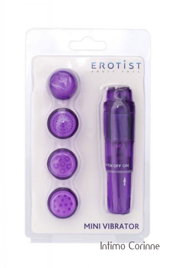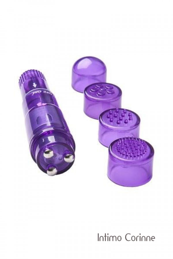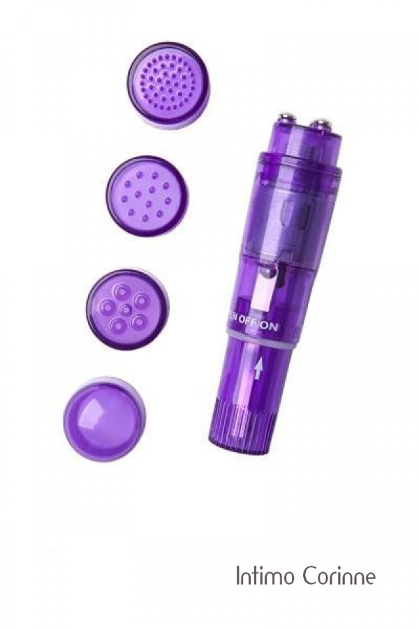 Mini massaggiatore viola vibrante, adatto a massaggiare localmente ogni zona del corpo. Corredato di 4 inserti con testine diverse in base al tipo di sollecitazione. Le 10 modalità di vibrazione possono essere facilmente controllate premendo un pulsante. Lunghezza completa 12,9 cm, ø 2.3-2.6 cm, ø di ogni accessorio 2,4 cm. Materiale: ABS, senza ftalati secondo il regolamento UE REACH. Necessita di una batteria stilo (1 x AA).