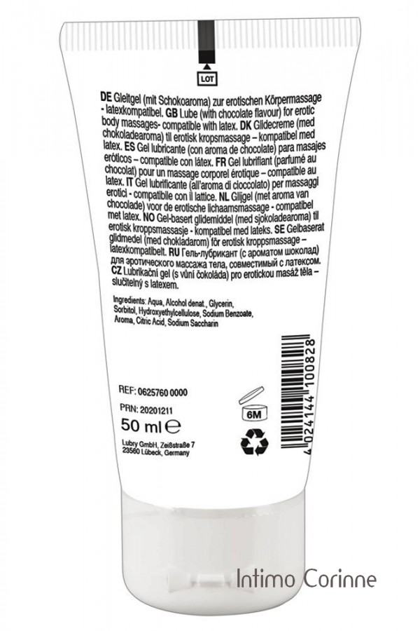 Risveglia il desiderio di baci intimi! Gel vegano a base d'acqua con profumo ed aroma al cioccolato bianco per un massaggio erotico su tutto il corpo. Flacone da 50 ml. Compatibile con il lattice.