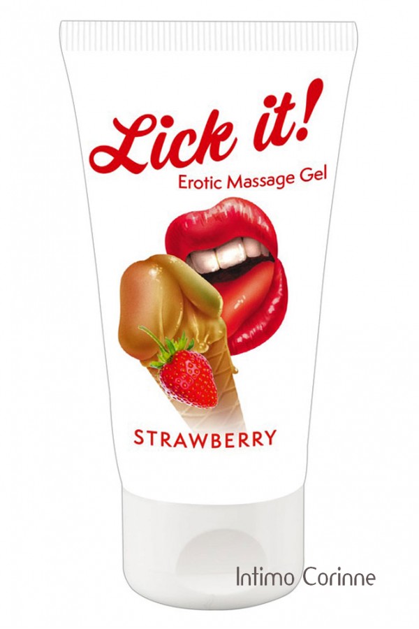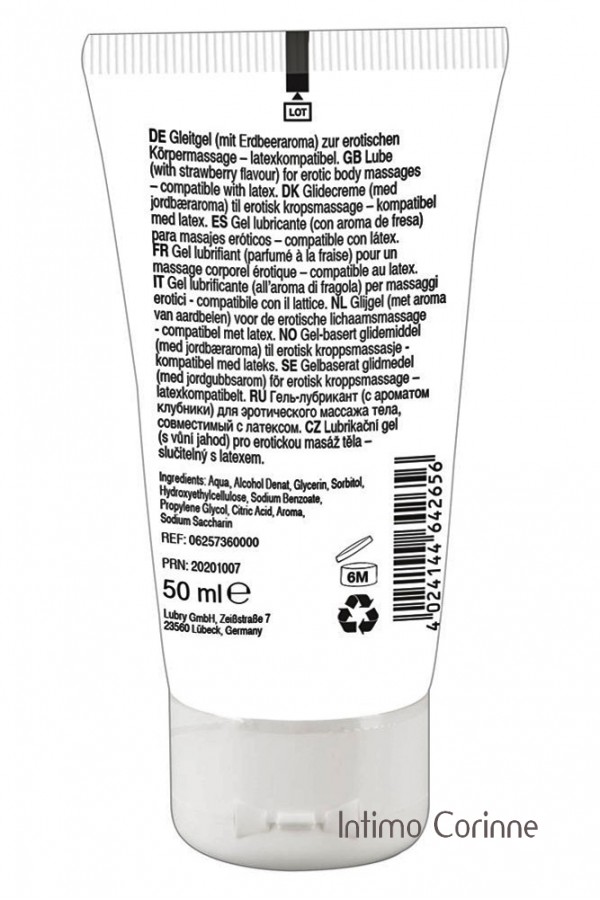 Risveglia il desiderio di baci intimi! Gel vegano a base d'acqua con profumo ed aroma alla fragola per un massaggio erotico su tutto il corpo. Flacone da 50 ml. Compatibile con il lattice.