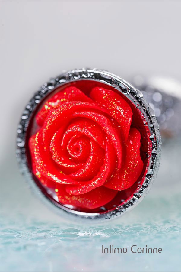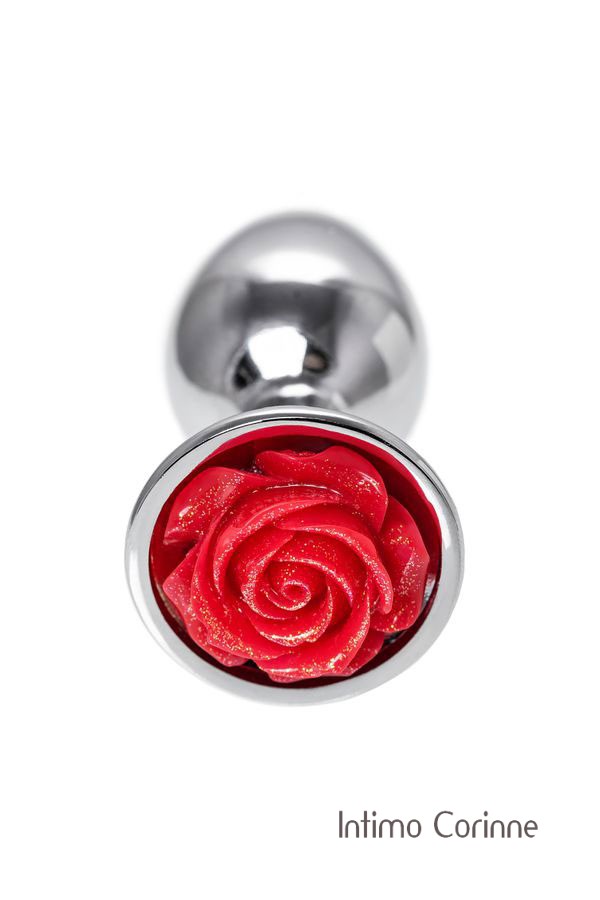 Plug in metallo con elemento decorativo all'estremità a forma di rosa rossa. Color argento.