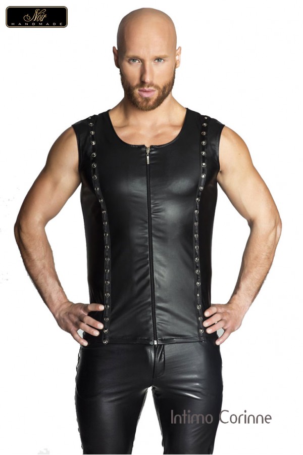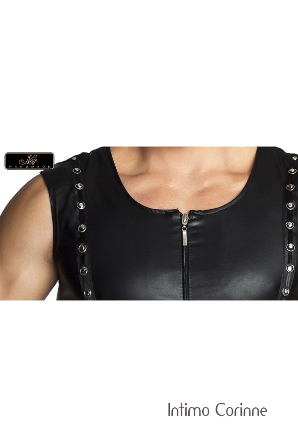 Smanicato realizzato in ottimo tessuto effetto bagnato con borchie ed anellini metallici lungo due linee verticali frontali e cerniera al centro.