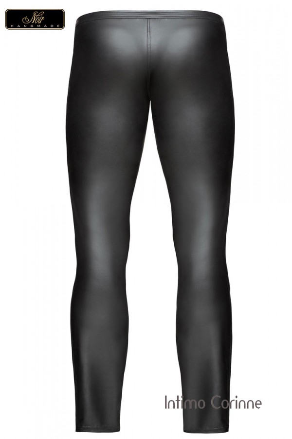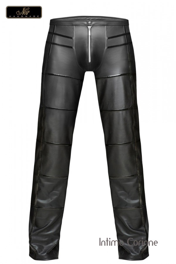 Pantaloni lunghi da uomo aderenti realizzati con morbido tessuto lucido elasticizzato effetto bagnato con applicazioni di strisce orizzontali in pvc. Cerniera anteriore argentata. Un capo esclusivo di alta qualità della collezione Noir Handmade prodotto in Europa. Ottenibile anche in numerose taglie comode.